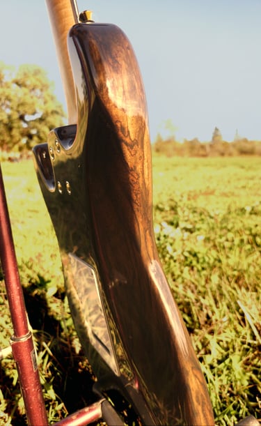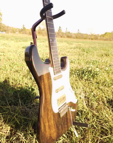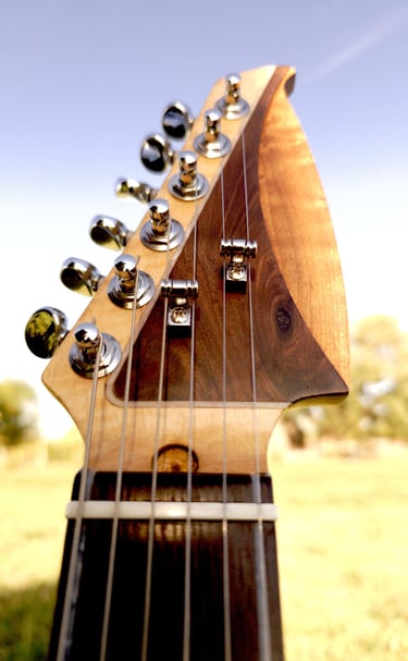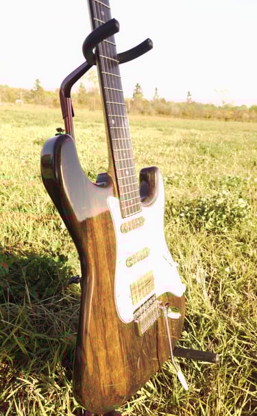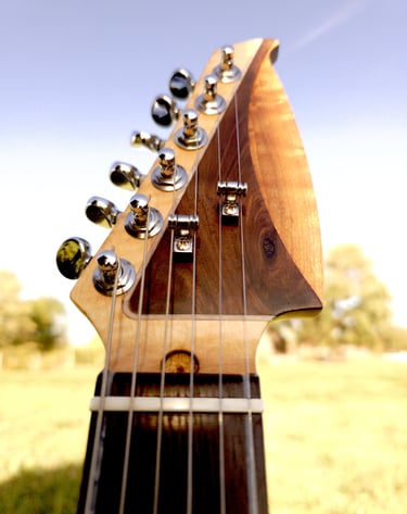 This Cormorant is the prototype for our model of S-Styled guitars. In other words, it is truly one of a kind. The headstock on this guitar is a unique, multilayered and multileveled with locally sourced black walnut, roasted maple and unroasted maple.